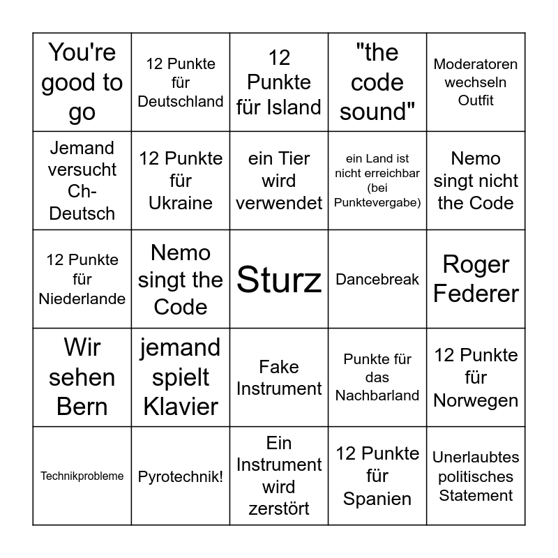 This bingo card has a free space and 54 words: Nemo wird erwähnt, Wir sehen Bern, Pride Flag, Landessprache, Fake Instrument, Hazel verdreht die Augen, "the code sound", Windmaschine, Jemand versucht Ch-Deutsch, Schweden bekommt 12 Punkte, You're good to go, Land bekommt 0 Punkte, Pyrotechnik!, Technikprobleme, Good evening Switzerland, Ein Instrument wird zerstört, Unerlaubtes politisches Statement, ein Land ist nicht erreichbar (bei Punktevergabe), alter ESC Teilnehmer vergibt Punkte, Roger Federer, Punkte für das Nachbarland, Zu viel Haut, Dancebreak, Moderatoren wechseln Outfit, 12 Punkte für Schweden, 12 Punkte für Deutschland, 12 Punkte für Schweiz, 12 Punkte für Israel, 12 Punkte für Polen, 12 Punkte für Spanien, 12 Punkte für Frankreich, 12 Punkte für UK, 12 Punkte für Albanien, 12 Punkte für Estland, 12 Punkte für Island, 12 Punkte für Italien, 12 Punkte für Niederlande, 12 Punkte für Norwegen, 12 Punkte für Portugal, 12 Punkte für Ukraine, Komentator sagt etwas totes, Celin Dion, Moderatoren haben Outfits passend zur Flagge, singen in Landessprache, jemand spielt Klavier, Irgendwas schwebt, Stroposkoplicht, Masken, ein Tier wird verwendet, Nemo singt the Code, Nemo singt nicht the Code, Schweizer Kultur, Douze Points and Goldregen.