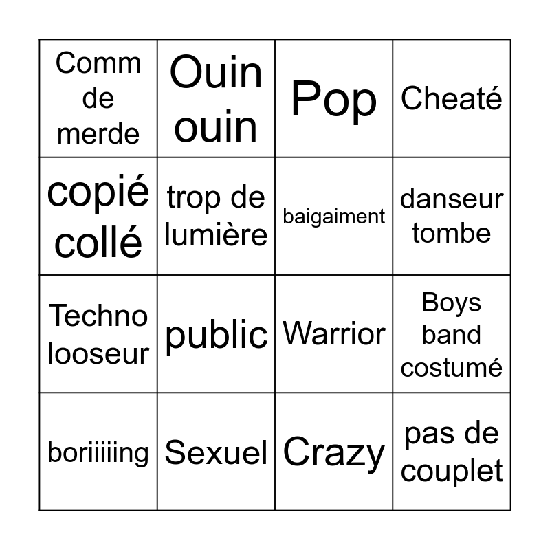 This bingo card has 16 words: Sexuel, Boys band costumé, Pop, Comm de merde, Techno looseur, Ouin ouin, Warrior, Crazy, copié collé, trop de lumière, boriiiiing, Cheaté, public, danseur tombe, baigaiment and pas de couplet.