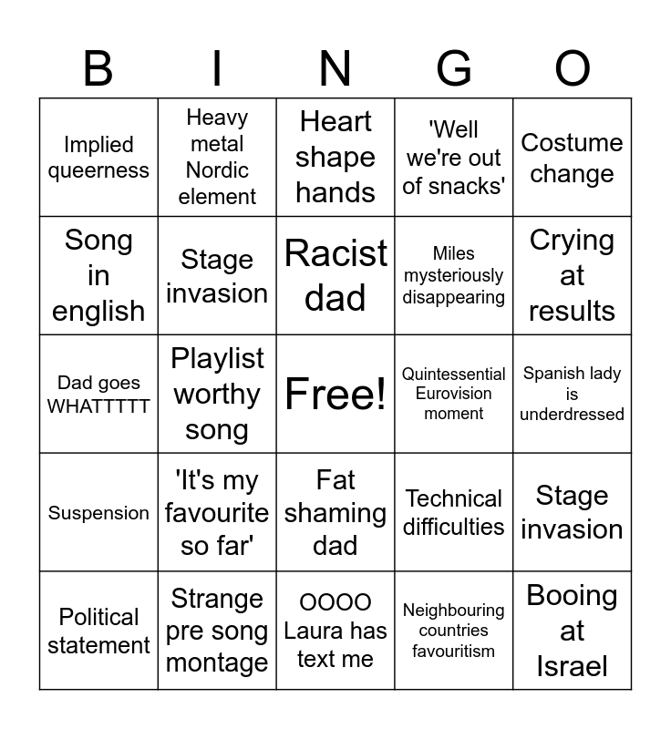 This bingo card has a free space and 24 words: 'It's my favourite so far', Strange pre song montage, Racist dad, Political statement, Costume change, Implied queerness, Song in english, Heavy metal Nordic element, Quintessential Eurovision moment, Fat shaming dad, Miles mysteriously disappearing, Dad goes WHATTTTT, Technical difficulties, Stage invasion, Stage invasion, Neighbouring countries favouritism, Spanish lady is underdressed, Heart shape hands, Crying at results, Playlist worthy song, Booing at Israel, Suspension, 'Well we're out of snacks' and OOOO Laura has text me.