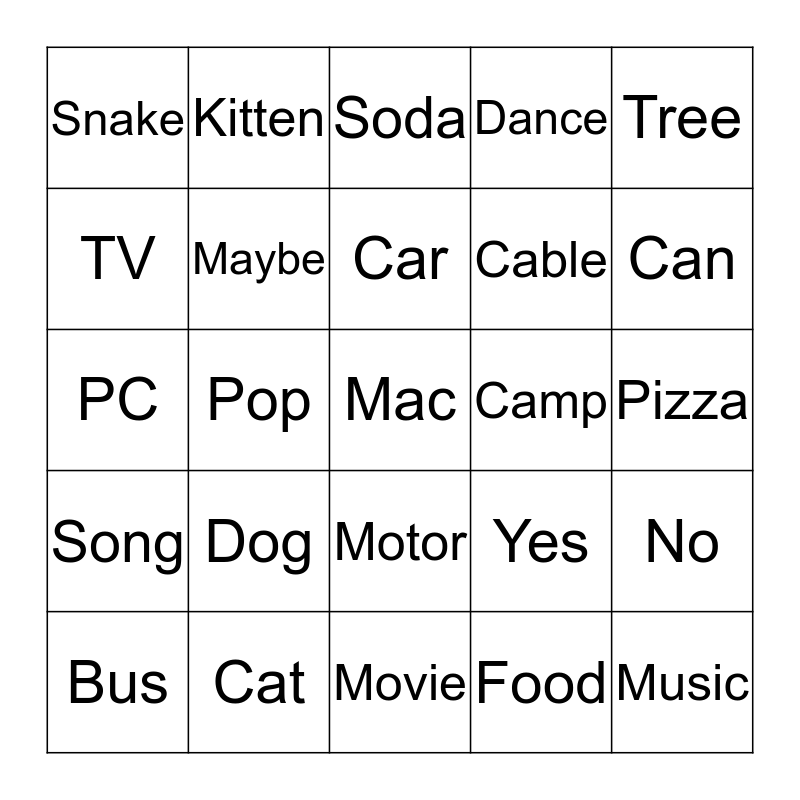 This bingo card has a free space and 24 words: Dog, Cat, Car, Bus, Tree, Snake, TV, Kitten, Camp, Motor, Cable, PC, Yes, No, Maybe, Food, Pizza, Soda, Can, Pop, Music, Song, Dance and Movie.