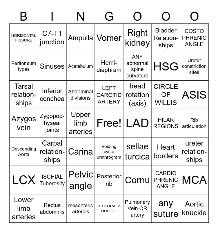 This bingo card has a free space and 48 words: Cornu, HSG, PECTORALIS MUSCLE, Zygopop- hyseal joints, Abdominal divisions, Rib articulation, C7-T1 junction, Rectus abdominis, Bladder Relation- ships, Voiding cysto urethrogram, COSTO PHRENIC ANGLE, Vomer, CIRCLE OF WILLIS, head rotation (axis), LCX, HILAR REGIONS, Peritoneum types, Ureter constriction sites, CARDIO PHRENIC ANGLE, Right kidney, ANY abnormal spine curvature, Upper limb arteries, HORIZONTAL FISSURE, Sinuses, MCA, Acetebulum, ASIS, Lower limb arteries, LEFT CAROTID ARTERY, Inferior conchea, any suture, LAD, ureter relation- ships, ISCHIAL Tuberosity, Azygos vein, sellae turcica, Heart borders, Tarsal relation-ships, Carina, Pelvic angle, Descending Aorta, Aortic knuckle, Ampulla, mesenteric arteries, Hemi- diaphram, Posterior rib, Carpal relation-ships and Pulmonary Vein OR artery.