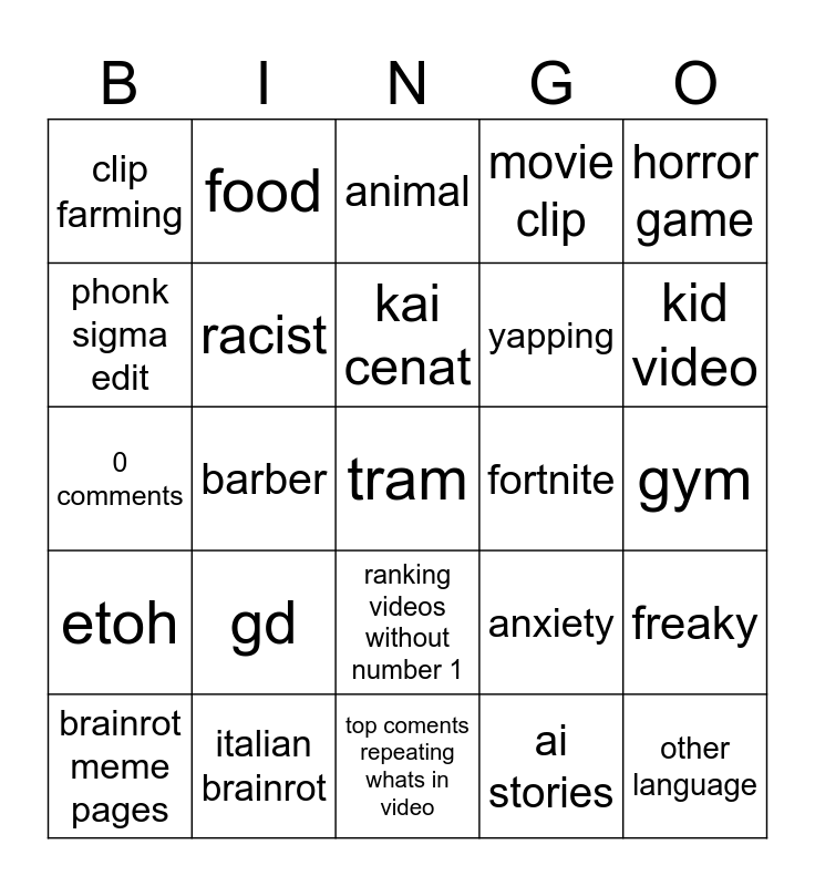 This bingo card has a free space and 24 words: gd, italian brainrot, kai cenat, brainrot meme pages, horror game, clip farming, phonk sigma edit, food, fortnite, ranking videos without number 1, yapping, 0 comments, anxiety, freaky, racist, ai stories, gym, animal, kid video, barber, other language, etoh, movie clip and top coments repeating whats in video.