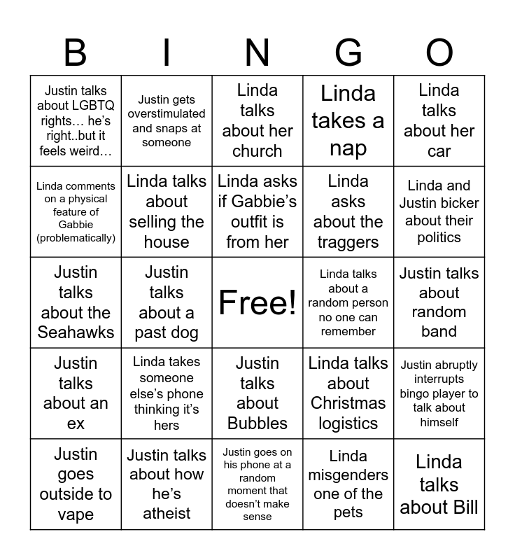 This bingo card has a free space and 24 words: Linda takes someone else’s phone thinking it’s hers, Justin talks about how he’s atheist, Linda asks if Gabbie’s outfit is from her, Justin goes outside to vape, Linda talks about her car, Justin talks about LGBTQ rights… he’s right..but it feels weird…, Linda comments on a physical feature of Gabbie (problematically), Justin gets overstimulated and snaps at someone, Linda talks about a random person no one can remember, Justin talks about Bubbles, Linda asks about the traggers, Justin talks about the Seahawks, Linda talks about Christmas logistics, Justin abruptly interrupts bingo player to talk about himself, Linda talks about selling the house, Linda misgenders one of the pets, Justin talks about random band, Linda talks about her church, Linda and Justin bicker about their politics, Justin talks about a past dog, Linda talks about Bill, Justin talks about an ex, Linda takes a nap and Justin goes on his phone at a random moment that doesn’t make sense.