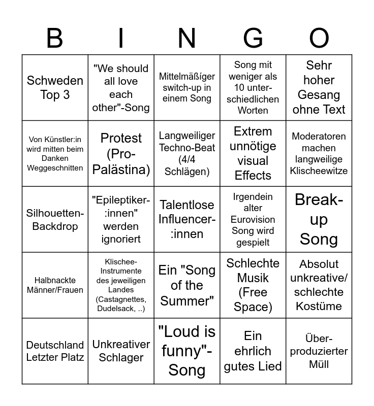 This bingo card has 25 words: Klischee- Instrumente des jeweiligen Landes (Castagnettes, Dudelsack, ..), "Loud is funny"-Song, Langweiliger Techno-Beat (4/4 Schlägen), Deutschland Letzter Platz, Sehr hoher Gesang ohne Text, Schweden Top 3, Von Künstler:in wird mitten beim Danken Weggeschnitten, "We should all love each other"-Song, Irgendein alter Eurovision Song wird gespielt, Ein "Song of the Summer", Extrem unnötige visual Effects, Silhouetten- Backdrop, Schlechte Musik (Free Space), Absolut unkreative/ schlechte Kostüme, Protest (Pro-Palästina), Über-produzierter Müll, Break-up Song, Mittelmäßíger switch-up in einem Song, Moderatoren machen langweilige Klischeewitze, "Epileptiker- :innen" werden ignoriert, Talentlose Influencer- :innen, Unkreativer Schlager, Halbnackte Männer/Frauen, Song mit weniger als 10 unter- schiedlichen Worten and Ein ehrlich gutes Lied.