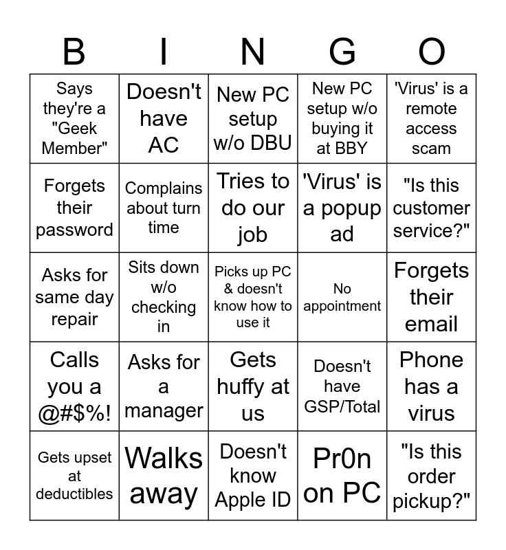 This bingo card has a free space and 24 words: Asks for a manager, Walks away, Tries to do our job, Gets upset at deductibles, 'Virus' is a remote access scam, Says they're a "Geek Member", Forgets their password, Doesn't have AC, No appointment, Gets huffy at us, 'Virus' is a popup ad, Asks for same day repair, Doesn't have GSP/Total, Phone has a virus, Complains about turn time, Pr0n on PC, Forgets their email, New PC setup w/o DBU, "Is this customer service?", Sits down w/o checking in, "Is this order pickup?", Calls you a @#$%!, New PC setup w/o buying it at BBY and Doesn't know Apple ID.