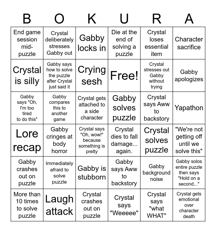 This bingo card has 36 words: Gabby says Aww to backstory, Gabby is stubborn, Crystal says "Weeeee", Crystal is silly, Lore recap, Gabby solves puzzle, Gabby says how to solve the puzzle after Crystal just said it, Crystal crashes out on puzzle, Crystal loses essential item, Gabby background noise, Gabby apologizes, Die at the end of solving a puzzle, Gabby solos entire puzzle then says "Hold on a second...", Gabby compares this to another game, Free!, End game session mid-puzzle, Gabby crashes out on puzzle, Crystal says Aww to backstory, Gabby says "Oh, I'm too tired to do this", Gabby locks in, Crystal gets attached to a side character, Gabby cringes at body horror, Crystal dies to fall damage... again., Crystal says "Oh, wow!" because something is pretty, Crystal solves puzzle, Crystal deliberately stresses Gabby out, Crystal stresses out Gabby without trying, Laugh attack, Crying sesh, Character sacrifice, Crystal gets emotional over character death, More than 10 times to solve puzzle, "We're not getting off until we solve this", Yapathon, Immediately afraid to solve puzzle and Crystal says "what WHAT".