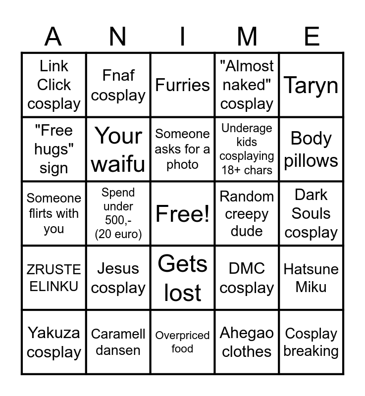 This bingo card has a free space and 24 words: Jesus cosplay, Caramell dansen, Someone asks for a photo, Yakuza cosplay, Taryn, Link Click cosplay, "Free hugs" sign, Fnaf cosplay, Random creepy dude, Gets lost, Underage kids cosplaying 18+ chars, Someone flirts with you, DMC cosplay, Hatsune Miku, Your waifu, Ahegao clothes, Dark Souls cosplay, Furries, Body pillows, Spend under 500,- (20 euro), Cosplay breaking, ZRUSTE ELINKU, "Almost naked" cosplay and Overpriced food.
