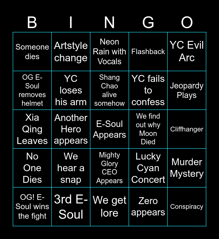 This bingo card has a free space and 29 words: OG! E-Soul wins the fight, Yang Cheng wins the fight, Another Hero appears, Training arc, Someone dies, Neon Rain with Vocals, YC loses his arm, We hear a snap, We find out why Moon Died, 3rd E-Soul, Cliffhanger, Conspiracy, We get lore, Zero appears, Jeopardy Plays, New Villain, Mighty Glory CEO Appears, No One Dies, YC Evil Arc, Xia Qing Leaves, Lucky Cyan Concert, PV scenes, YC fails to confess, OG E-Soul removes helmet, Flashback, Artstyle change, Murder Mystery, Shang Chao alive somehow and ANY E!SOUL DIES.