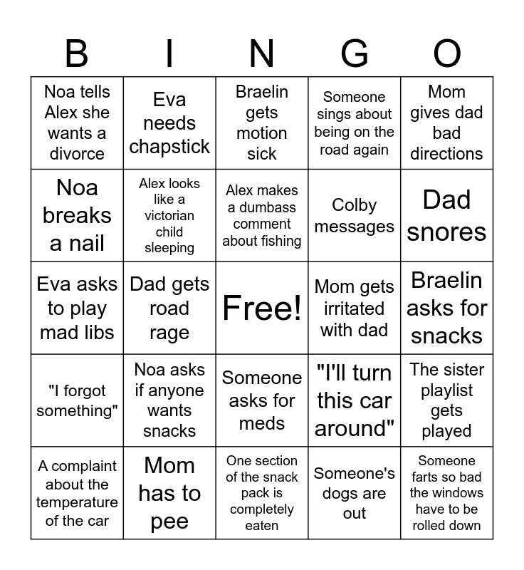 This bingo card has a free space and 24 words: Noa asks if anyone wants snacks, Mom has to pee, Alex makes a dumbass comment about fishing, A complaint about the temperature of the car, Mom gives dad bad directions, Noa tells Alex she wants a divorce, Noa breaks a nail, Eva needs chapstick, Mom gets irritated with dad, Someone asks for meds, Colby messages, Eva asks to play mad libs, "I'll turn this car around", The sister playlist gets played, Alex looks like a victorian child sleeping, Someone's dogs are out, Braelin asks for snacks, Braelin gets motion sick, Dad snores, Dad gets road rage, Someone farts so bad the windows have to be rolled down, "I forgot something", Someone sings about being on the road again and One section of the snack pack is completely eaten.
