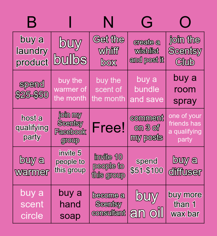 This bingo card has a free space and 24 words: invite 5 people to this group, buy a hand soap, buy the scent of the month, buy a scent circle, join the Scentsy Club, buy a laundry product, spend $25-$50, buy bulbs, comment on 3 of my posts, invite 10 people to this group, buy a bundle and save, host a qualifying party, spend $51-$100, buy a diffuser, buy the warmer of the month, buy an oil, one of your friends has a qualifying party, Get the whiff box, buy a room spray, join my Scentsy Facebook group, buy more than 1 wax bar, buy a warmer, create a wishlist and post it and become a Scentsy consultant.