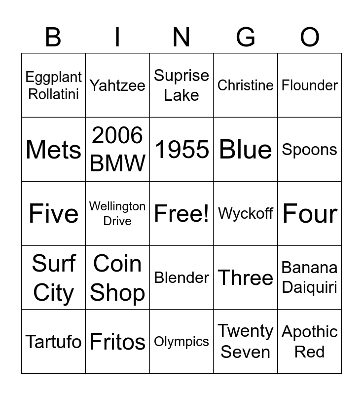 This bingo card has a free space and 24 words: Coin Shop, Fritos, 1955, Tartufo, Flounder, Eggplant Rollatini, Mets, Yahtzee, Wyckoff, Blender, Blue, Five, Three, Banana Daiquiri, 2006 BMW, Twenty Seven, Four, Suprise Lake, Spoons, Wellington Drive, Apothic Red, Surf City, Christine and Olympics.