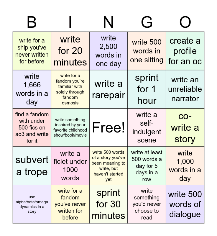 This bingo card has a free space and 24 words: write a ficlet under 1000 words, write for a fandom you've never written for before, write a rarepair, use alpha/beta/omega dynamics in a story, create a profile for an oc, write for a ship you've never written for before, write 1,666 words in a day, write for 20 minutes, write a self-indulgent scene, write 500 words of a story you've been meaning to write, but haven't started yet, sprint for 1 hour, find a fandom with under 500 fics on ao3 and write for it, write at least 500 words a day for 5 days in a row, write 1,000 words in a day, write for a fandom you're familiar with solely through fandom osmosis, write something you'd never choose to read, co-write a story, write 2,500 words in one day, write an unreliable narrator, write something inspired by your favorite childhood show/book/movie, write 500 words of dialogue, subvert a trope, write 500 words in one sitting and sprint for 30 minutes.
