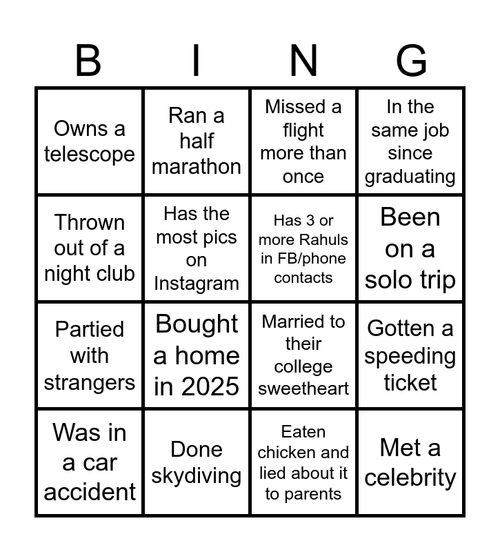 This bingo card has 16 words: Done skydiving, Gotten a speeding ticket, Missed a flight more than once, Owns a telescope, Partied with strangers, Ran a half marathon, Married to their college sweetheart, Eaten chicken and lied about it to parents, Thrown out of a night club, Has the most pics on Instagram, Was in a car accident, In the same job since graduating, Bought a home in 2025, Been on a solo trip, Has 3 or more Rahuls in FB/phone contacts and Met a celebrity.