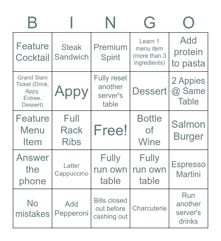 This bingo card has a free space and 24 words: Latte/ Cappuccino, Add Pepperoni, Fully reset another server's table, No mistakes, Add protein to pasta, Feature Cocktail, Grand Slam Ticket (Drink, Appy, Entree, Dessert), Steak Sandwich, Bottle of Wine, Fully run own table, Dessert, Feature Menu Item, Fully run own table, Espresso Martini, Appy, Charcuterie, Salmon Burger, Premium Spirit, 2 Appies @ Same Table, Full Rack Ribs, Run another server's drinks, Answer the phone, Learn 1 menu item (more than 3 ingredients) and Bills closed out before cashing out.