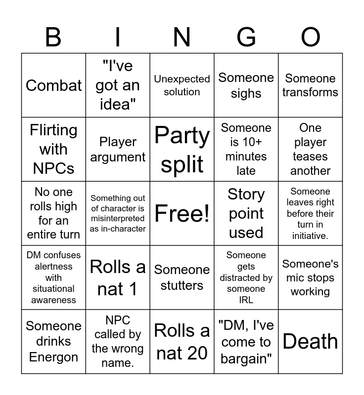 This bingo card has a free space and 24 words: Rolls a nat 1, NPC called by the wrong name., Party split, Someone drinks Energon, Someone transforms, Combat, Flirting with NPCs, "I've got an idea", Story point used, Someone stutters, Someone is 10+ minutes late, No one rolls high for an entire turn, Someone gets distracted by someone IRL, Someone's mic stops working, Player argument, "DM, I've come to bargain", Someone leaves right before their turn in initiative., Unexpected solution, One player teases another, Something out of character is misinterpreted as in-character, Death, DM confuses alertness with situational awareness, Someone sighs and Rolls a nat 20.