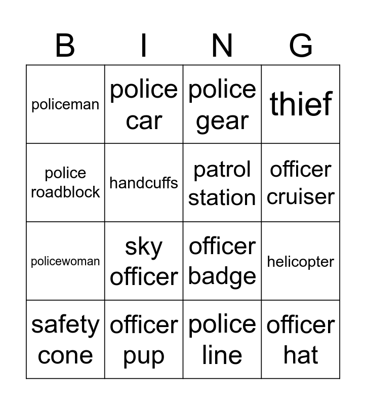 This bingo card has 16 words: officer pup, helicopter, police gear, policeman, policewoman, police car, officer badge, police line, police roadblock, handcuffs, safety cone, thief, sky officer, officer cruiser, patrol station and officer hat.