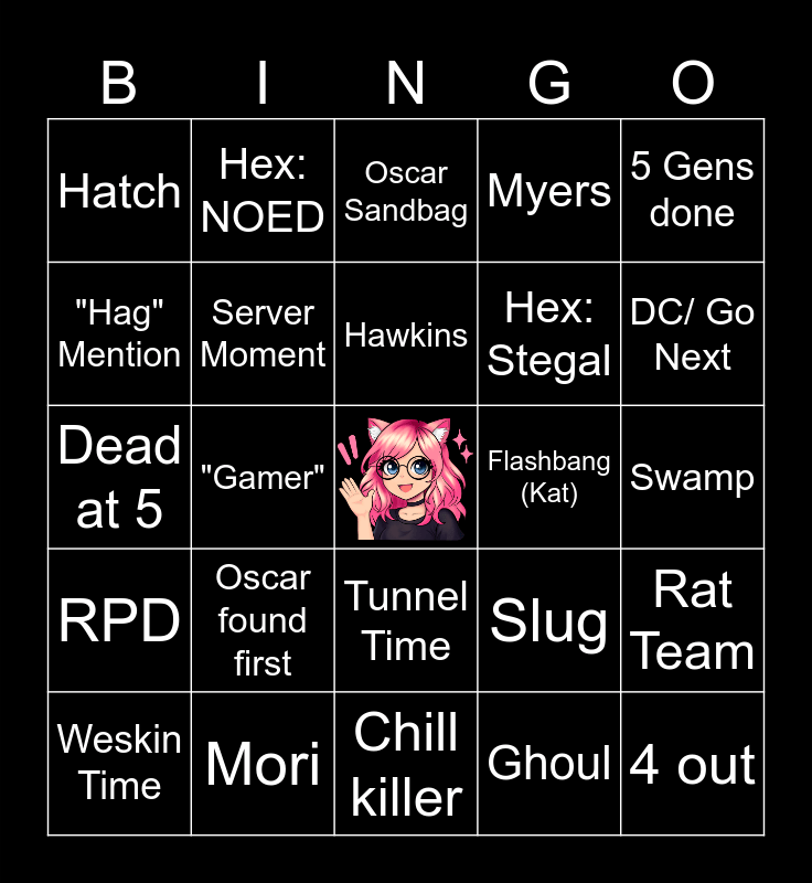 This bingo card has a free space and 24 words: Oscar found first, Mori, Hawkins, Weskin Time, 5 Gens done, Hatch, "Hag" Mention, Hex: NOED, Flashbang (Kat), Tunnel Time, Hex: Stegal, Dead at 5, Slug, Rat Team, Server Moment, Ghoul, Swamp, Oscar Sandbag, DC/ Go Next, "Gamer", 4 out, RPD, Myers and Chill killer.