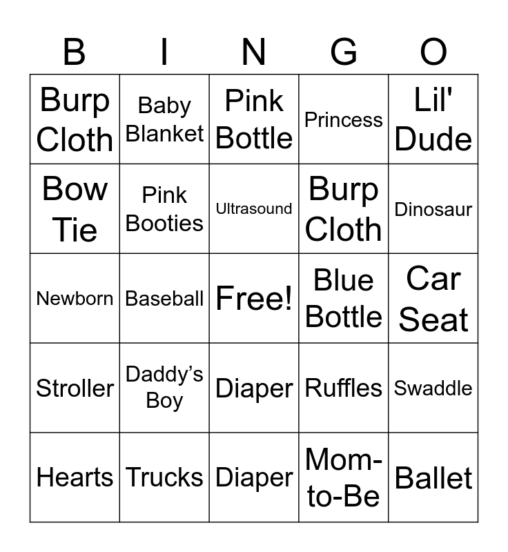 This bingo card has a free space and 87 words: Pacifier, Onesie, Diaper, Stroller, Crib, Baby Bottle, Bib, Booties, Burp Cloth, Baby Wipes, Lullaby, Rocking Chair, Swaddle, Car Seat, Nursery, Ultrasound, Baby Powder, Mobile, Teddy Bear, Teether, Bath Time, Bundle of Joy, Newborn, Pink or Blue, Mom-to-Be, Daddy Duty, Due Date, Little One, Bundle of Joy, Little Man, Trucks, Sports, Blue Booties, Daddy’s Boy, Bow Tie, Overalls, Dinosaur, Baby Boy, Mustache, Baseball, Wild One, King of Cuddles, Toy Car, Blue Bottle, Suspenders, Lil' Dude, Big Bro, Baby Blanket, Diaper, Crib, Onesie, Pacifier, Stroller, Baby Wipes, Lullaby, Car Seat, Burp Cloth, “It’s a Boy!”, Little Lady, Princess, Pink Booties, Tea Party, Mommy’s Girl, Hair Bow, Tutu, Unicorn, Baby Girl, Hearts, Ballet, Sweet Pea, Queen of Cuddles, Doll, Pink Bottle, Ruffles, Lil' Miss, Big Sis, Baby Blanket, Diaper, Crib, Onesie, Pacifier, Stroller, Baby Wipes, Lullaby, Car Seat, Burp Cloth and “It’s a Girl!”.
