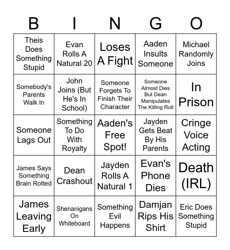 This bingo card has a free space and 24 words: Dean Crashout, Shenanigans On Whiteboard, Someone Forgets To Finish Their Character, James Leaving Early, Michael Randomly Joins, Theis Does Something Stupid, Somebody's Parents Walk In, Evan Rolls A Natural 20, Jayden Gets Beat By His Parents, Jayden Rolls A Natural 1, Someone Almost Dies But Dean Manipulates The Killing Roll, Someone Lags Out, Evan's Phone Dies, Death (IRL), John Joins (But He's In School), Damjan Rips His Shirt, Cringe Voice Acting, Loses A Fight, In Prison, Something To Do With Royalty, Eric Does Something Stupid, James Says Something Brain Rotted, Aaden Insults Someone and Something Evil Happens.