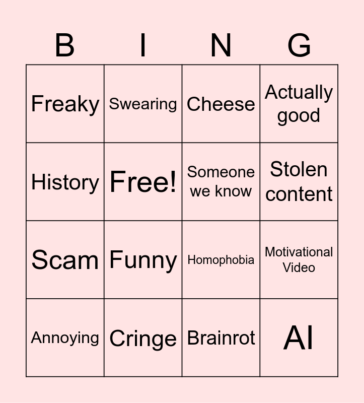This bingo card has 16 words: Cringe, Motivational Video, Cheese, Freaky, Scam, Swearing, Homophobia, Brainrot, History, Free!, Annoying, Actually good, Funny, Stolen content, Someone we know and AI.