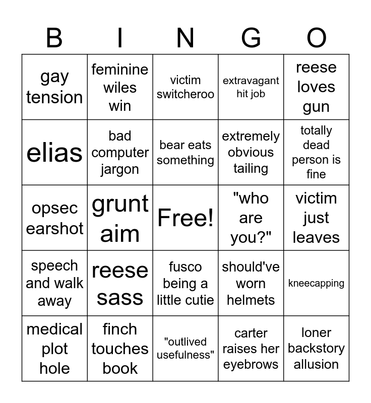 This bingo card has a free space and 26 words: fusco being a little cutie, carter raises her eyebrows, bear eats something, finch touches book, reese loves gun, gay tension, elias, feminine wiles win, victim just leaves, should've worn helmets, extremely obvious tailing, opsec earshot, kneecapping, medical plot hole, grunt aim, music choreography, extravagant hit job, speech and walk away, victim switcheroo, loner backstory allusion, totally dead person is fine, "outlived usefulness", "who are you?", reese sass, bad computer jargon and unilateral hangup.