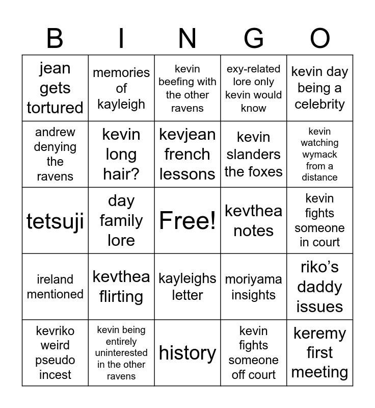 This bingo card has a free space and 24 words: kevthea flirting, kevin being entirely uninterested in the other ravens, kevjean french lessons, kevriko weird pseudo incest, kevin day being a celebrity, jean gets tortured, andrew denying the ravens, memories of kayleigh, kevthea notes, kayleighs letter, kevin slanders the foxes, tetsuji, moriyama insights, riko’s daddy issues, kevin long hair?, kevin fights someone off court, kevin fights someone in court, kevin beefing with the other ravens, kevin watching wymack from a distance, day family lore, keremy first meeting, ireland mentioned, exy-related lore only kevin would know and history.