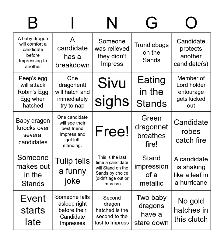 This bingo card has a free space and 24 words: Tulip tells a funny joke, Someone falls asleep right before their Candidate Impresses, Sivu sighs, Event starts late, Candidate protects another candidate(s), A baby dragon will comfort a candidate before Impressing to another, Peep's egg will attack Robin's Egg Egg when hatched, A candidate has a breakdown, Green dragonnet breathes fire!, This is the last time a candidate will Stand on the Sands by choice (didn't age out or Impress), Eating in the Stands, Baby dragon knocks over several candidates, Stand impression of a metallic, A candidate is shaking like a leaf in a hurricane, One dragonentt will hatch and immediately try to nap, Two baby dragons have a stare down, Candidate robes catch fire, Someone was relieved they didn't Impress, Member of Lord holder entourage gets kicked out, One candidate will see their best friend Impress and get left standing., No gold hatches in this clutch, Someone makes out in the Stands, Trundlebugs on the Sands and Second dragon hatched is the second to the last to Impress.