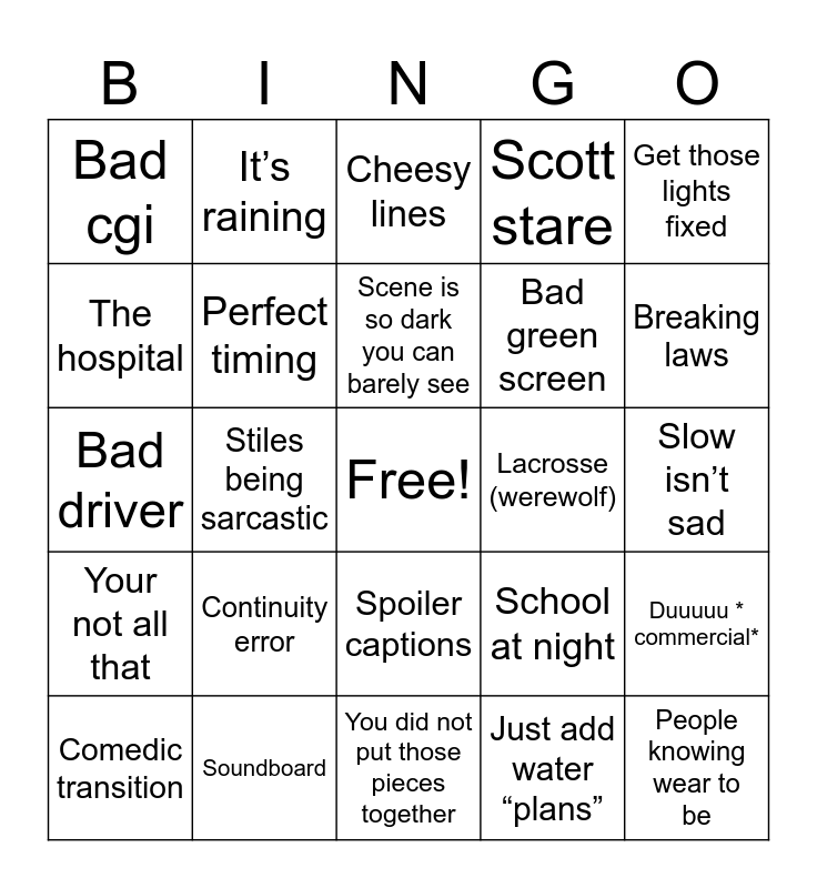 This bingo card has a free space and 51 words: Stiles, People knowing wear to be, Lying or doing things for no reason, You did not put those pieces together, Continuity error, People switching up to fast, It’s raining, Being vague, The hospital, Mom breaking hospital laws, Perfect timing, Scott stare, Duuuuu * commercial*, School at night, school having no security, Music is played too loud, Scene is so dark you can barely see, Lacrosse (werewolf), Your not spider man, Get those lights fixed, Stiles being sarcastic, Just add water “plans”, Bad cgi, Bad green screen, Acting like no one can hear you, Why are you at bedroom door, Breaking laws, Curious killed the cat, Comedic transition, Cheesy lines, Creepy instead of scary, What are you on about?, Get to it, Werewolf’s not being werewolf’s, It’ll heal, Soundboard, And they’re gone, Unnecessary backflip, Guess who it is?, Mr. Obvious, Slow isn’t sad, Your not all that, Queer baiting, What is this music?, Product placement, Do you hear that?, Bad driver, Bad phone call skills, What is that outfit, Spoiler captions and “True alpha”.