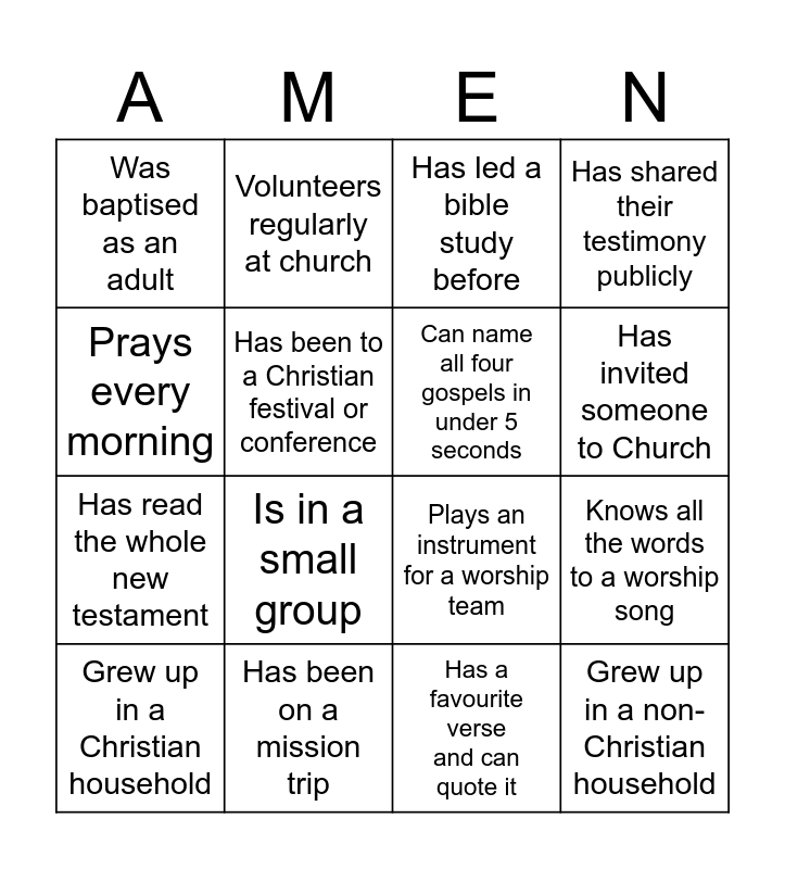 This bingo card has 16 words: Has been on a mission trip, Knows all the words to a worship song, Has led a bible study before, Was baptised as an adult, Has read the whole new testament, Volunteers regularly at church, Plays an instrument for a worship team, Has a favourite verse and can quote it, Prays every morning, Has been to a Christian festival or conference, Grew up in a Christian household, Has shared their testimony publicly, Is in a small group, Has invited someone to Church, Can name all four gospels in under 5 seconds and Grew up in a non-Christian household.