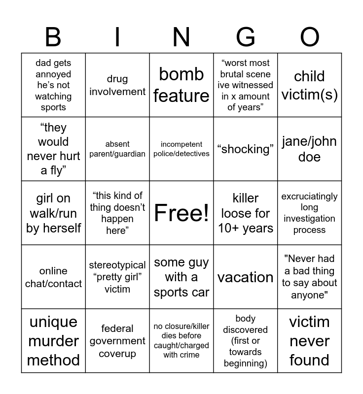 This bingo card has a free space and 34 words: mormons, body discovered (first or towards beginning), mental illness, insane parent/guardian, online chat/contact, absent parent/guardian, child victim(s), unique murder method, drug involvement, alcohol involvement, incompetent police/detectives, bomb feature, domestic terrorism, we solve crime before before police do, killer loose for 10+ years, jane/john doe, federal government coverup, girl on walk/run by herself, stereotypical “pretty girl” victim, vacation, some guy with a sports car, killer’s identity is a complete curveball, dad gets annoyed he’s not watching sports, excruciatingly long investigation process, no closure/killer dies before caught/charged with crime, victim never found, “worst most brutal scene ive witnessed in x amount of years”, “all american town”, “shocking”, “they would never hurt a fly”, “perfect couple/marriage”, “this kind of thing doesn’t happen here”, "Never had a bad thing to say about anyone" and cold case.