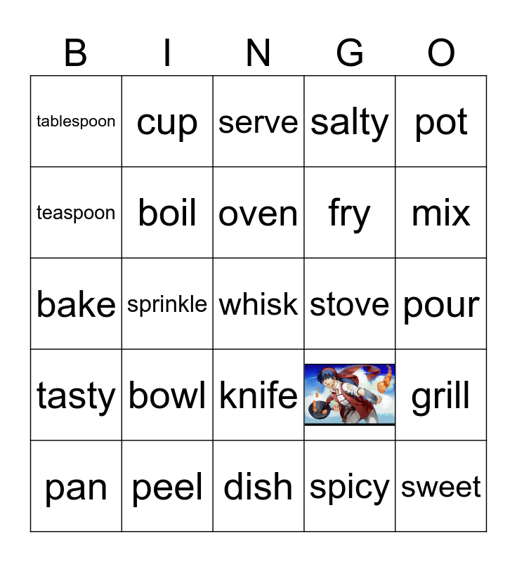 This bingo card has 1 images and 24 words: bowl, dish, oven, pan, pot, tablespoon, teaspoon, cup, stove, knife, fry, bake, grill, boil, sweet, pour, serve, mix, sprinkle, whisk, peel, tasty, salty and spicy.