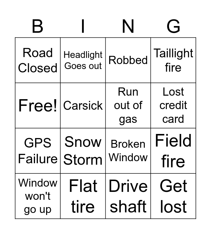 This bingo card has 16 words: Flat tire, Field fire, Robbed, Road Closed, GPS Failure, Headlight Goes out, Broken Window, Drive shaft, Free!, Carsick, Window won't go up, Taillight fire, Snow Storm, Lost credit card, Run out of gas and Get lost.