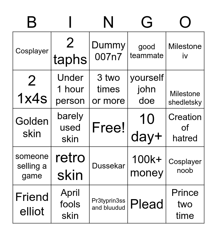 This bingo card has a free space and 24 words: retro skin, April fools skin, 3 two times or more, Friend elliot, Milestone iv, Cosplayer, 2 1x4s, 2 taphs, 10 day+, Dussekar, yourself john doe, Golden skin, 100k+ money, Cosplayer noob, Under 1 hour person, Plead, Creation of hatred, Dummy 007n7, Milestone shedletsky, barely used skin, Prince two time, someone selling a game, good teammate and Pr3typrin3ss and bluudud.