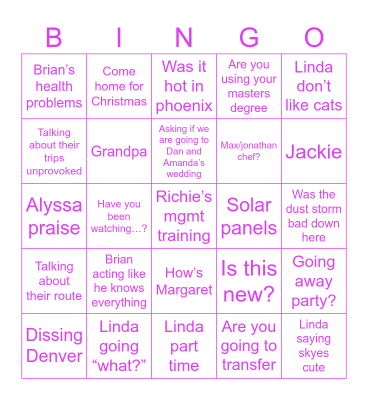 This bingo card has a free space and 24 words: Brian acting like he knows everything, Linda going “what?”, Asking if we are going to Dan and Amanda’s wedding, Dissing Denver, Linda don’t like cats, Brian’s health problems, Talking about their trips unprovoked, Come home for Christmas, Solar panels, How’s Margaret, Max/jonathan chef?, Alyssa praise, Is this new?, Going away party?, Grandpa, Are you going to transfer, Was the dust storm bad down here, Was it hot in phoenix, Jackie, Have you been watching…?, Linda saying skyes cute, Talking about their route, Are you using your masters degree and Linda part time.
