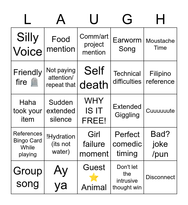This bingo card has a free space and 25 words: !Hydration (its not water), Guest ⭐ Animal, Self death, Group song, Moustache Time, Silly Voice, Friendly fire 🪦, Food mention, Extended Giggling, Girl failure moment, Technical difficulties, Haha took your item, Perfect comedic timing, Bad? joke /pun, Not paying attention/ repeat that, Well known meme quoted, Cuuuuuute, Comm/art project mention, Filipino reference, Sudden extended silence, Disconnect, Ay ya, References Bingo Card While playing, Earworm Song and Don't let the intrusive thought win.