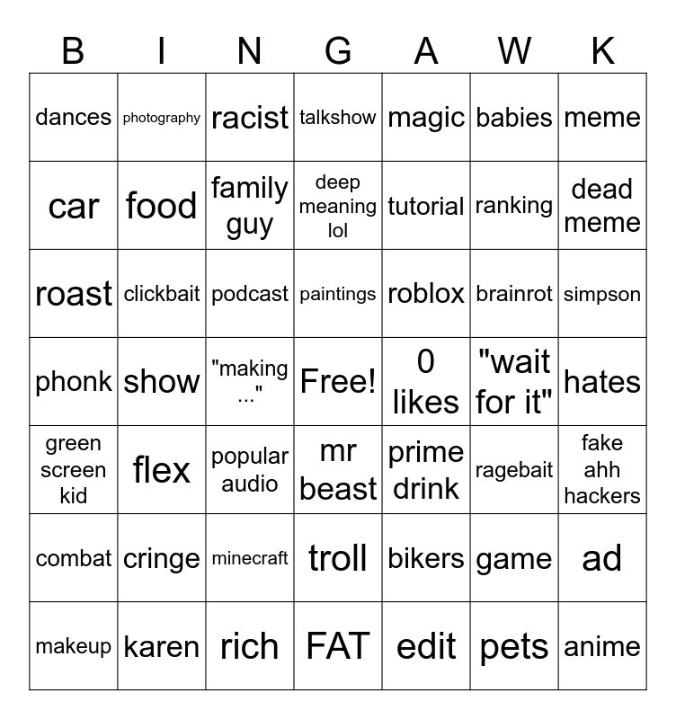 This bingo card has a free space and 48 words: bikers, ranking, FAT, show, podcast, hates, photography, karen, babies, mr beast, meme, talkshow, brainrot, roblox, combat, "wait for it", car, dead meme, game, magic, tutorial, "making ...", dances, food, ad, family guy, simpson, makeup, paintings, clickbait, pets, 0 likes, fake ahh hackers, cringe, phonk, prime drink, ragebait, roast, popular audio, minecraft, green screen kid, anime, racist, rich, deep meaning lol, troll, flex and edit.