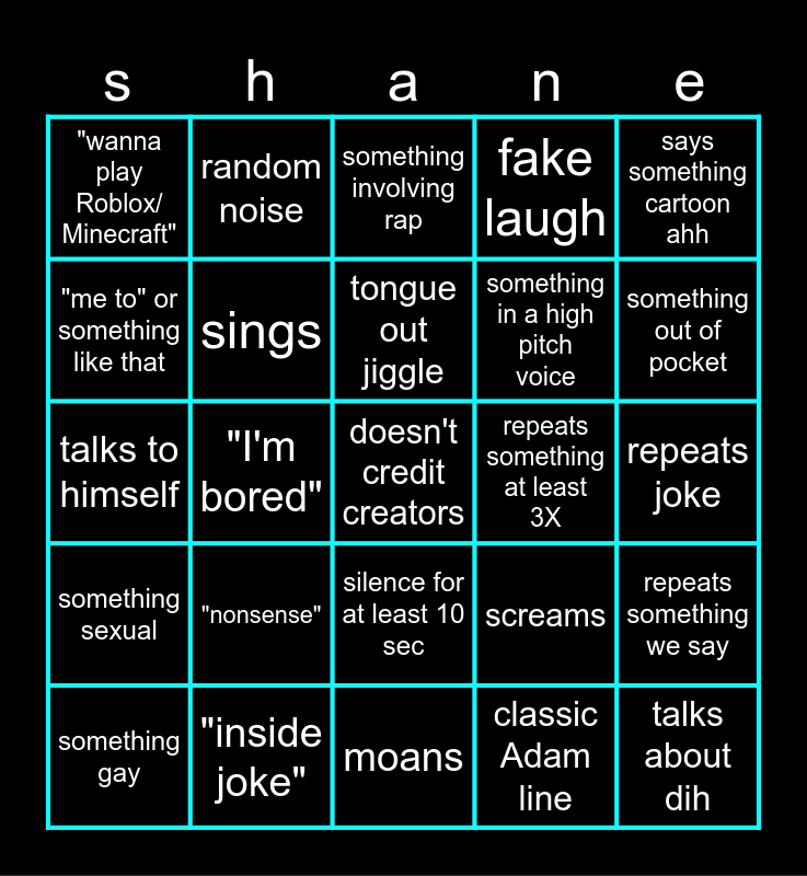 This bingo card has a free space and 29 words: something gay, shows feet, "I'm bored", "I'ma add___", "wanna play Roblox/ Minecraft", something involving rap, sings, "nonsense", repeats something at least 3X, "inside joke", repeats joke, talks about dih, moans, classic Adam line, something out of pocket, "NI--", silence for at least 10 sec, something sexual, says something cartoon ahh, talks to himself, screams, tells unfunny joke, something in a high pitch voice, "me to" or something like that, fake laugh, random noise, repeats something we say, tongue out jiggle and brainrot.