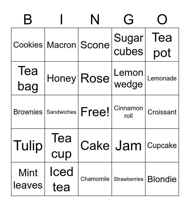 This bingo card has a free space and 24 words: Tea cup, Iced tea, Rose, Mint leaves, Tea pot, Cookies, Tea bag, Macron, Cinnamon roll, Cake, Lemon wedge, Brownies, Jam, Cupcake, Honey, Strawberries, Croissant, Scone, Lemonade, Sandwiches, Blondie, Tulip, Sugar cubes and Chamomile.