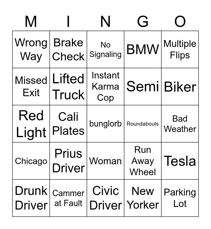 This bingo card has a free space and 24 words: Prius Driver, Cammer at Fault, Instant Karma Cop, Drunk Driver, Multiple Flips, Wrong Way, Missed Exit, Brake Check, Roundabouts, Woman, Semi, Red Light, Run Away Wheel, Tesla, Lifted Truck, New Yorker, Bad Weather, No Signaling, Biker, Cali Plates, Parking Lot, Chicago, BMW and Civic Driver.