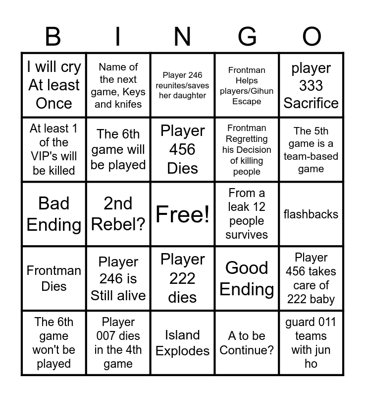 This bingo card has a free space and 24 words: Player 246 is Still alive, Player 007 dies in the 4th game, Player 456 Dies, The 6th game won't be played, player 333 Sacrifice, I will cry At least Once, At least 1 of the VIP's will be killed, Name of the next game, Keys and knifes, From a leak 12 people survives, Player 222 dies, Frontman Regretting his Decision of killing people, Bad Ending, Good Ending, Player 456 takes care of 222 baby, The 6th game will be played, A to be Continue?, flashbacks, Player 246 reunites/saves her daughter, The 5th game is a team-based game, 2nd Rebel?, guard 011 teams with jun ho, Frontman Dies, Frontman Helps players/Gihun Escape and Island Explodes.