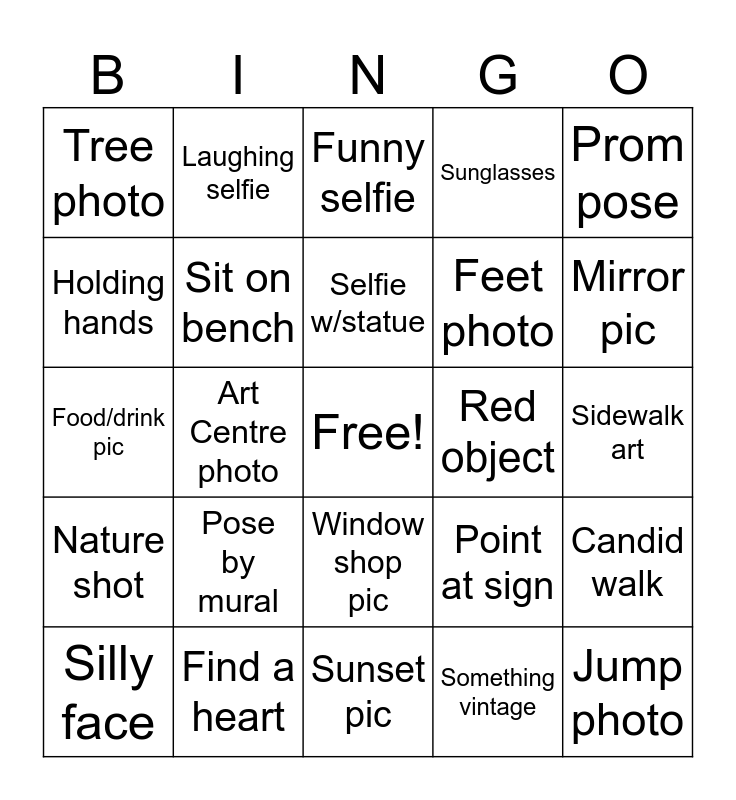 This bingo card has a free space and 24 words: Pose by mural, Find a heart, Selfie w/statue, Silly face, Prom pose, Tree photo, Holding hands, Laughing selfie, Red object, Window shop pic, Feet photo, Food/drink pic, Point at sign, Candid walk, Sit on bench, Something vintage, Sidewalk art, Funny selfie, Mirror pic, Art Centre photo, Jump photo, Nature shot, Sunglasses and Sunset pic.