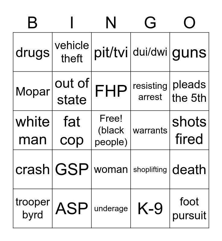 This bingo card has a free space and 24 words: GSP, ASP, FHP, trooper byrd, guns, drugs, Mopar, vehicle theft, warrants, woman, resisting arrest, white man, shoplifting, death, out of state, K-9, shots fired, pit/tvi, pleads the 5th, fat cop, foot pursuit, crash, dui/dwi and underage.
