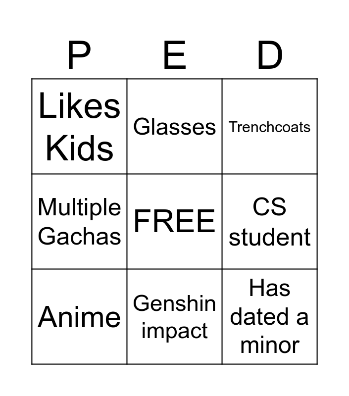 This bingo card has 9 words: Anime, Trenchcoats, Glasses, Multiple Gachas, Likes Kids, CS student, FREE, Has dated a minor and Genshin impact.