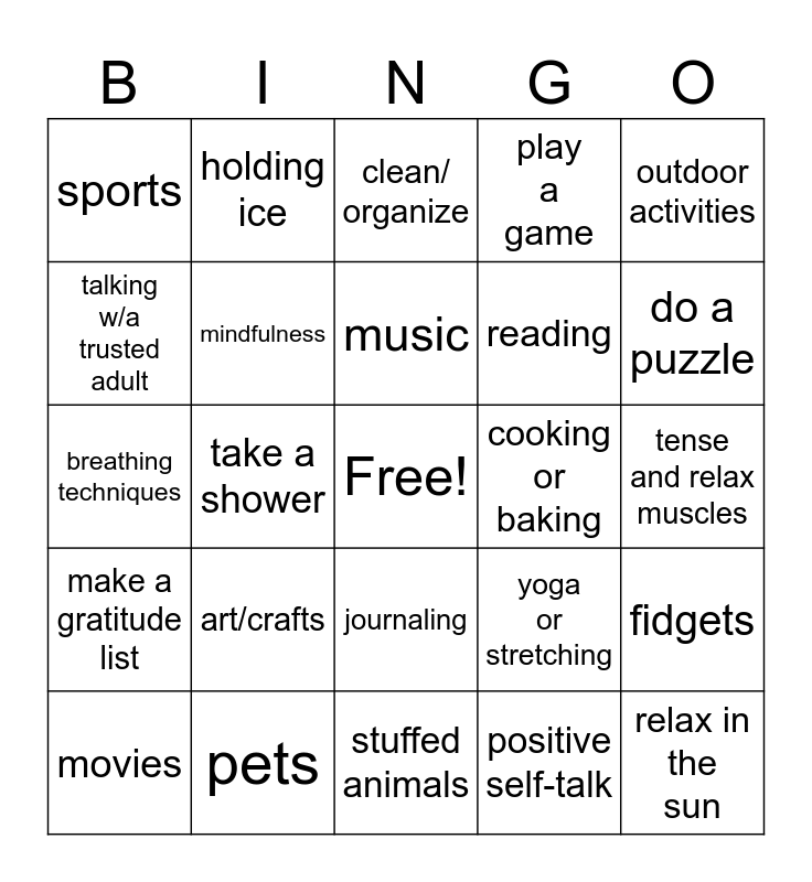 This bingo card has a free space and 24 words: art/crafts, pets, music, movies, outdoor activities, sports, talking w/a trusted adult, holding ice, cooking or baking, journaling, reading, breathing techniques, yoga or stretching, fidgets, mindfulness, positive self-talk, tense and relax muscles, clean/ organize, do a puzzle, take a shower, relax in the sun, make a gratitude list, play a game and stuffed animals.