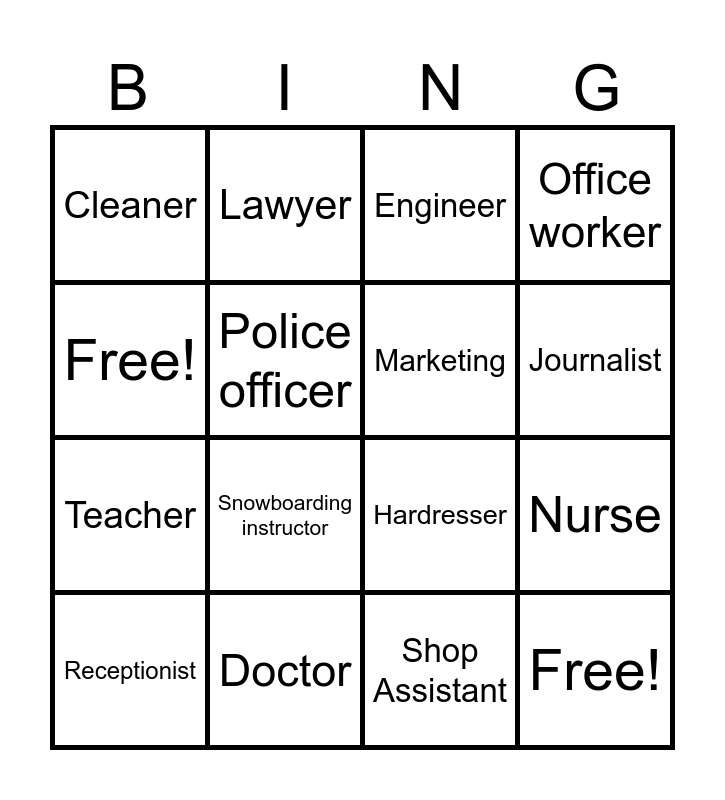 This bingo card has 16 words: Doctor, Nurse, Engineer, Cleaner, Teacher, Lawyer, Hardresser, Shop Assistant, Free!, Police officer, Receptionist, Office worker, Snowboarding instructor, Journalist, Marketing and Free!.