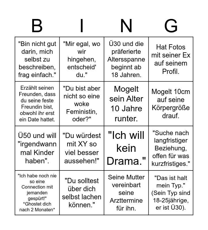 This bingo card has 16 words: "Du solltest über dich selbst lachen können.", "Suche nach langfristiger Beziehung, offen für was kurzfristiges.", Ü30 und die präferierte Altersspanne beginnt ab 18 Jahren., "Bin nicht gut darin, mich selbst zu beschreiben, frag einfach.", Ü50 und will "irgendwann mal Kinder haben"., "Mir egal, wo wir hingehen, entscheid' du.", "Ich will kein Drama.", Seine Mutter vereinbart seine Arzttermine für ihn., Erzählt seinen Freunden, dass du seine feste Freundin bist, obwohl ihr erst ein Date hattet., "Du bist aber nicht so eine woke Feministin, oder?", "Ich habe noch nie so eine Connection mit jemanden gespürt!" *Ghostet dich nach 2 Monaten*, Hat Fotos mit seiner Ex auf seinem Profil., "Du würdest mit XY so viel besser aussehen!", Mogelt 10cm auf seine Körpergröße drauf., Mogelt sein Alter 10 Jahre runter. and "Das ist halt mein Typ." (Sein Typ sind 18-25jährige, er ist Ü30)..