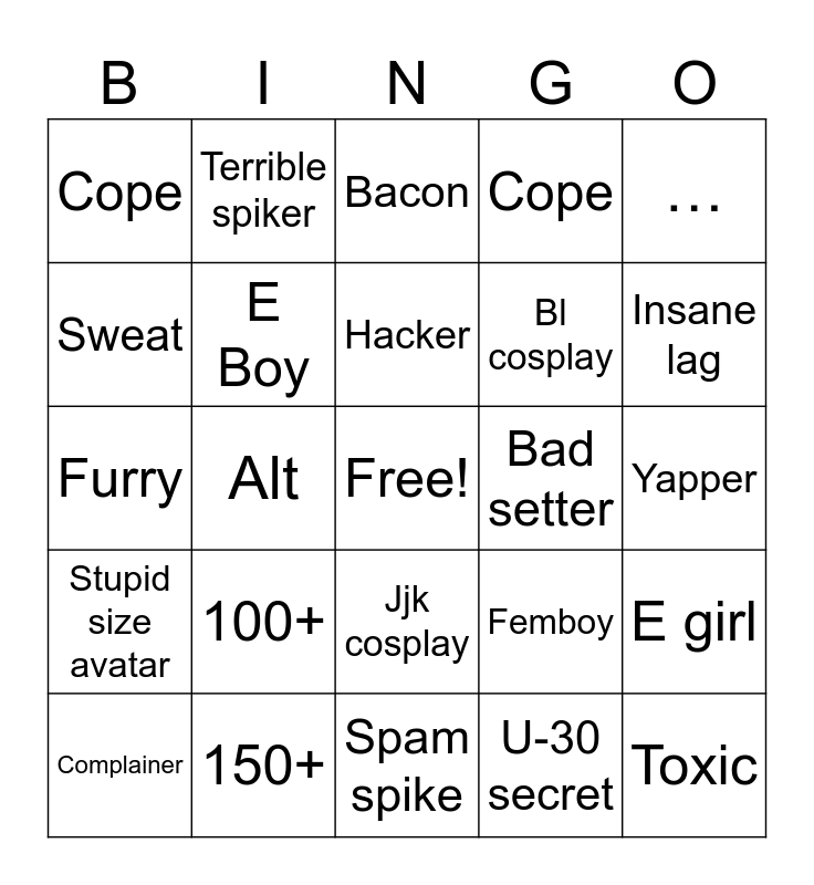 This bingo card has a free space and 24 words: 100+, 150+, Hacker, Complainer, …, Cope, Sweat, Terrible spiker, Bad setter, Jjk cosplay, Bl cosplay, Furry, Femboy, E girl, E Boy, U-30 secret, Yapper, Bacon, Insane lag, Alt, Toxic, Stupid size avatar, Cope and Spam spike.