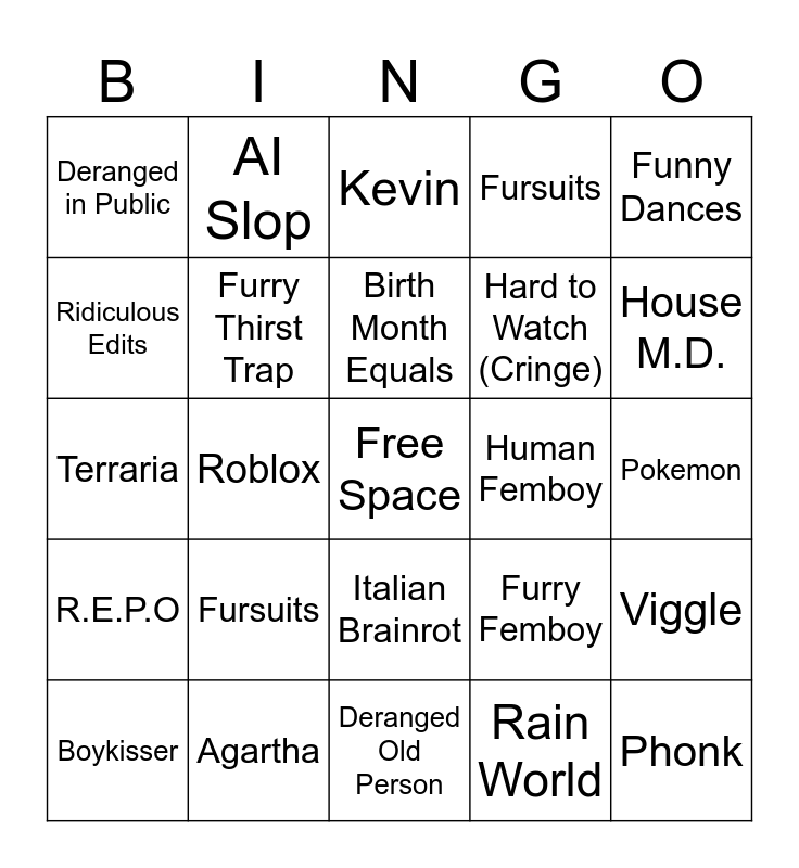 This bingo card has a free space and 29 words: Boykisser, Cats, Roblox, Geometry Dash, Deranged in Public, Kevin, Furry Thirst Trap, Fursuits, Human Femboy, Agartha, Pokemon, Phonk, Deranged Old Person, Rain World, House M.D., Dexter, Italian Brainrot, R.E.P.O, Funny Dances, Terraria, Furry Femboy, VG Femboy, Hard to Watch (Cringe), Ridiculous Edits, Fursuits, AI Slop, Viggle, Birth Month Equals and Meowl.