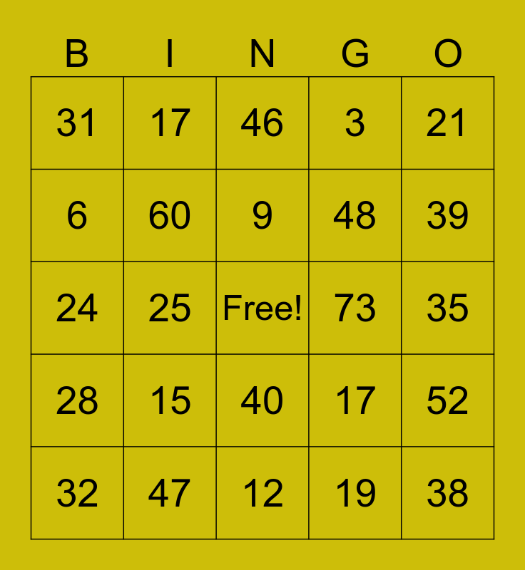 This bingo card has a free space and 24 words: 15, 47, 9, 32, 21, 31, 6, 17, 73, 40, 48, 24, 17, 52, 60, 19, 35, 46, 39, 25, 38, 28, 3 and 12.