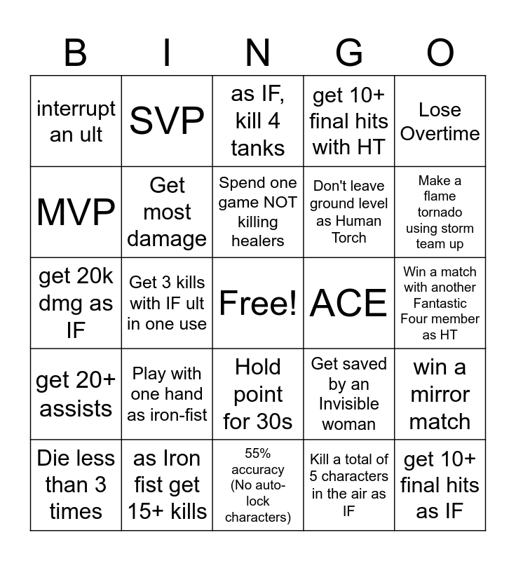 This bingo card has a free space and 24 words: Play with one hand as iron-fist, as Iron fist get 15+ kills, Spend one game NOT killing healers, Die less than 3 times, Lose Overtime, interrupt an ult, MVP, SVP, ACE, Hold point for 30s, Don't leave ground level as Human Torch, get 20k dmg as IF, Get saved by an Invisible woman, win a mirror match, Get most damage, Kill a total of 5 characters in the air as IF, Win a match with another Fantastic Four member as HT, as IF, kill 4 tanks, Make a flame tornado using storm team up, Get 3 kills with IF ult in one use, get 10+ final hits as IF, get 20+ assists, get 10+ final hits with HT and 55% accuracy (No auto-lock characters).